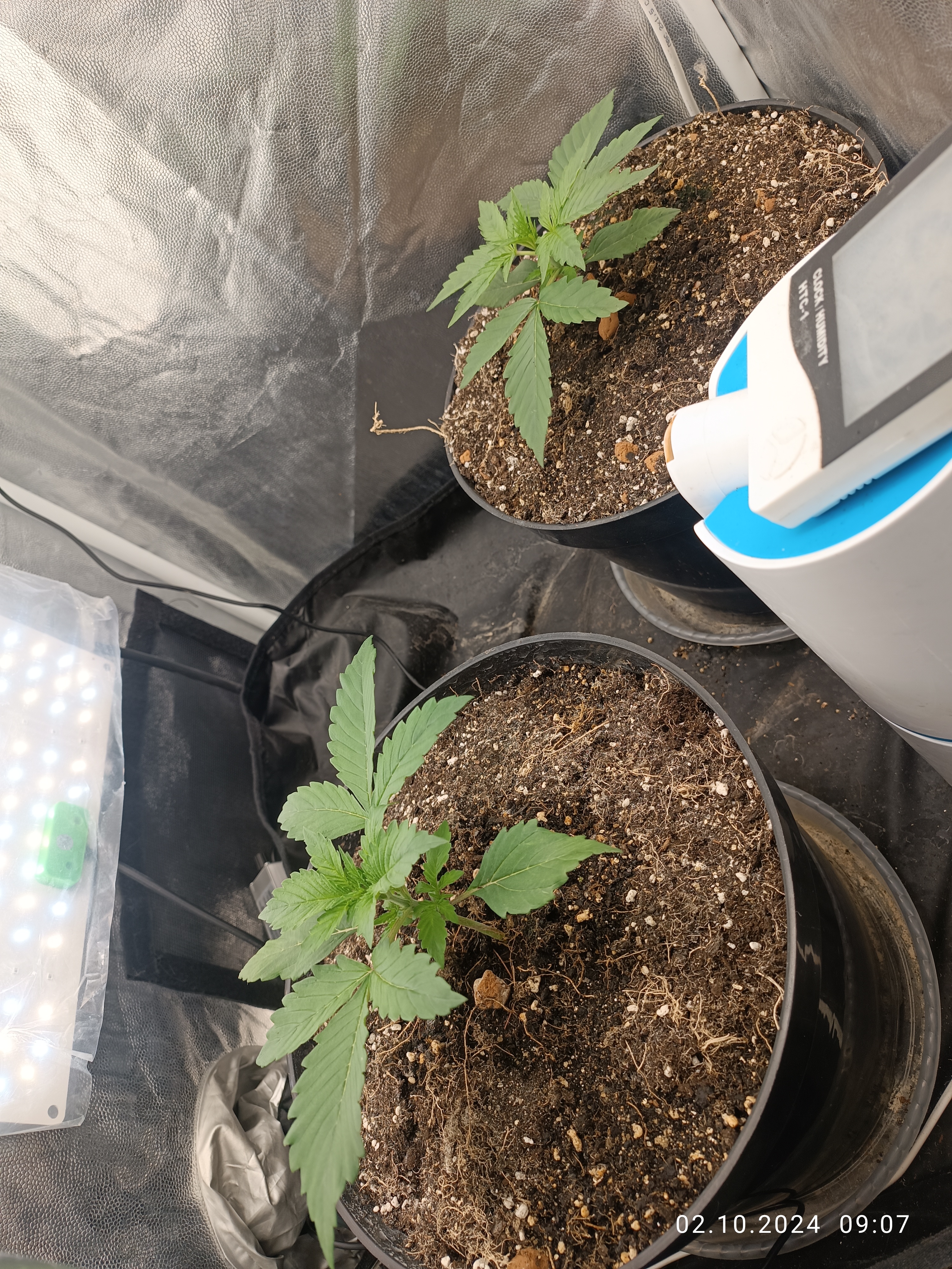 Семена проклюнулись через день замачивания, и 2ое суток после посадки показались ростки. Две недели рост хороший. Темпер 27, влажность 70-80, свет 120 Вт и подсвет 65 Вт режим 20/4. Замачивал в root juice и 2 недели поливал ph 6-7.
